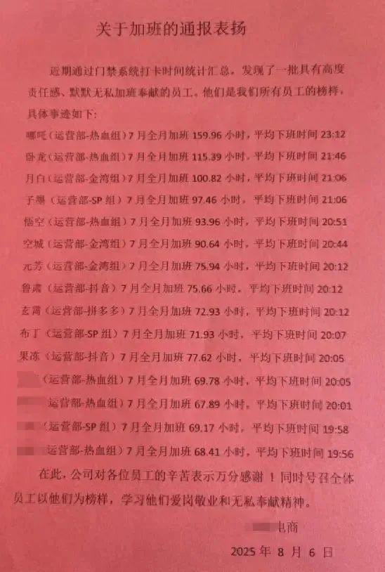據(jù)稱,這是該電商公司內(nèi)部定期發(fā)布的加班通報(bào)表?yè)P(yáng)“紅名單”。名單上的員工因“具有高度責(zé)任感、默默無私加班奉獻(xiàn)”上榜。在通報(bào)表?yè)P(yáng)的末尾,該公司號(hào)召全體員工以他們?yōu)榘駱樱瑢W(xué)習(xí)他們愛崗敬業(yè)和無私奉獻(xiàn)的精神。