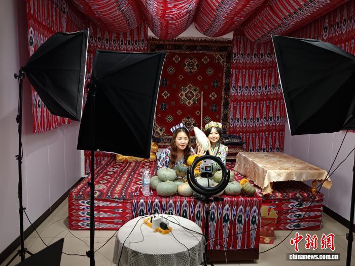 “直播間所見即所得!粉不粉?來,你們看看!”新疆阿克蘇市電商產(chǎn)業(yè)園的一個(gè)直播間里,主播雨桐正和搭檔一起賣南瓜,她穿著維吾爾族服飾,一邊用勺子刮著粉糯的南瓜一邊激情澎湃地介紹。