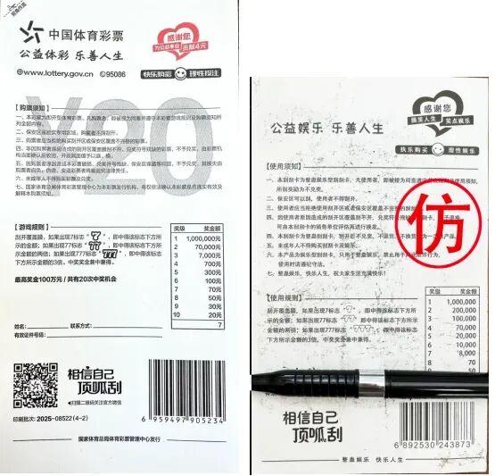 多地發(fā)生兌獎鬧劇,上演了人生倍速版“大起大落”。這些“整蠱彩票”都以即開型體育彩票為主。正規(guī)合法的即開型體育彩票到底長啥樣?根據國家體育總局體育彩票管理中心發(fā)布的聲明,即開型體育彩票使用環(huán)保紙張和油墨,綠色、健康、易刮開; 保安區(qū)和刮開區(qū)均有覆膜,票面印有防偽裝飾紋,圖案完整;票面印有體彩+頂呱刮標識及面值金額,刮開后的游戲區(qū)域有防偽底紋,且游戲符號、獎金標志清晰易辨別。票背 印有發(fā)行機構、公益金貢獻金額和官方網址等信息。