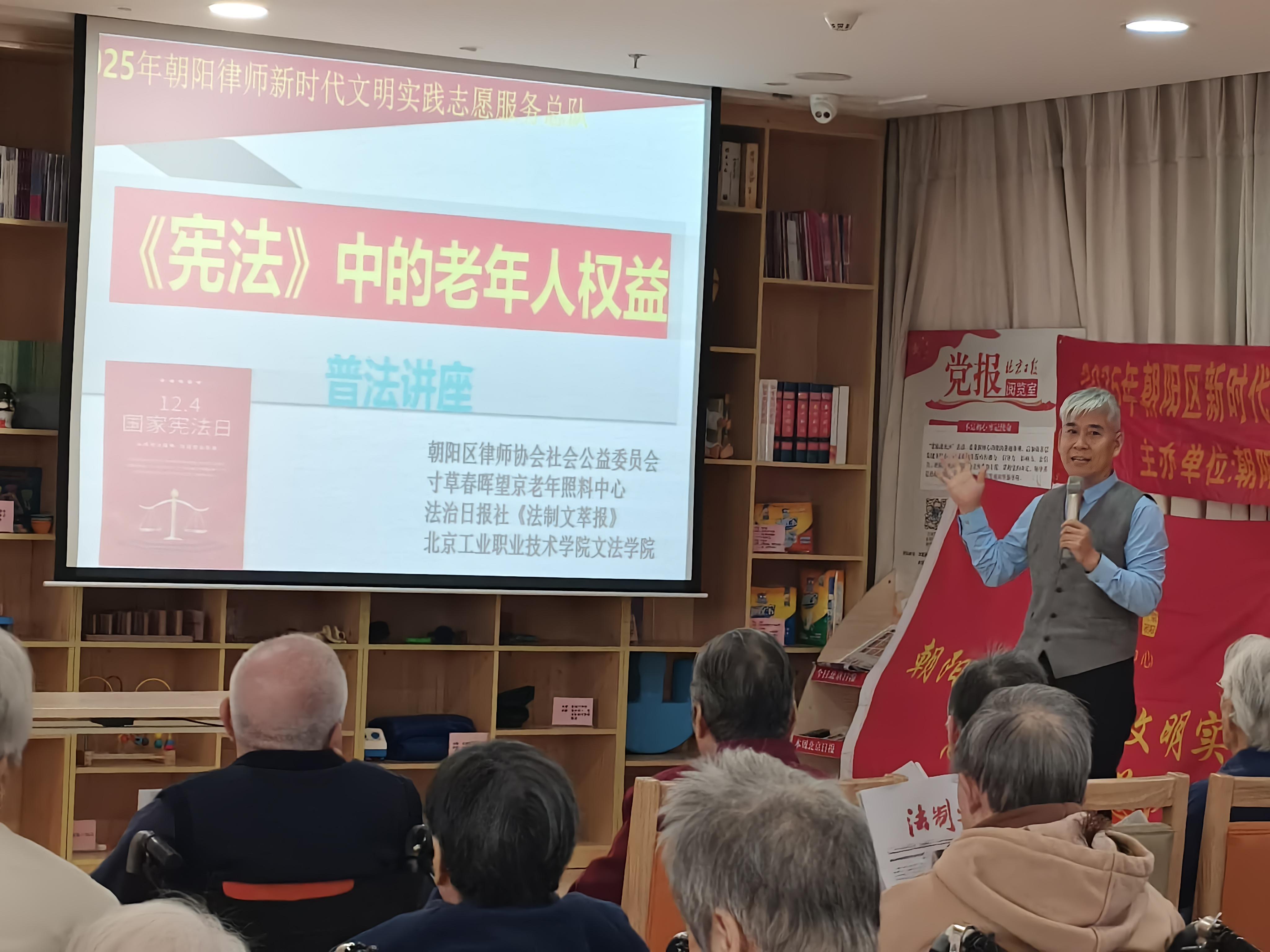 12月4日,在第十二個(gè)國家憲法日當(dāng)天,法治日?qǐng)?bào)社《法制文萃報(bào)》攜手北京市朝陽區(qū)律師協(xié)會(huì)公益與社會(huì)責(zé)任委員會(huì)律師團(tuán)、北京工業(yè)職業(yè)技術(shù)學(xué)院文法與管理學(xué)院師生,走進(jìn)寸草春暉望京老年公寓,以“弘揚(yáng)憲法精神,維護(hù)老年人權(quán)益”為主題開展公益普法活動(dòng),旨在讓法治服務(wù)觸手可及,讓憲法精神浸潤老年生活。