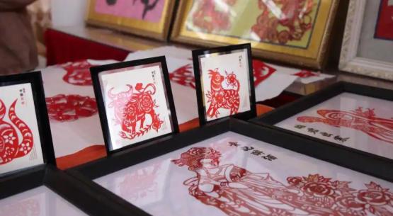 圖為甘肅省平?jīng)鍪徐`臺縣什字鎮(zhèn)文化廣場文化活動(dòng)室里的剪紙作品