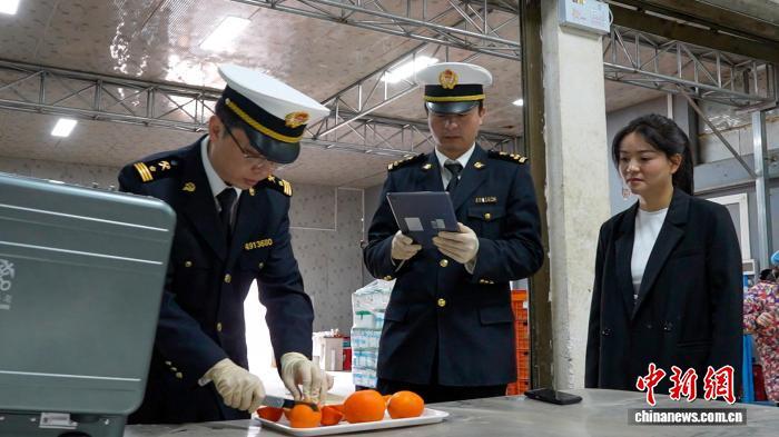 海關(guān)工作人員對橙子進行檢測。毛文濤 攝