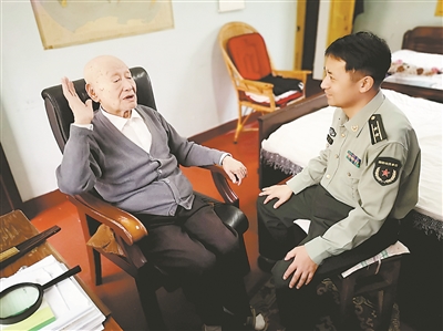 上圖為紀(jì)曉飛(右)傾聽(tīng)老干部講述戰(zhàn)斗故事。徐文靜 攝