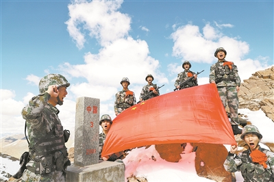 圖①:新疆軍區(qū)某邊防團退伍老兵在界碑前重溫軍人誓詞。