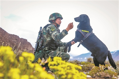 圖⑤:中士李江龍在巡邏途中照顧出現(xiàn)高原反應(yīng)的軍犬“吉普”。