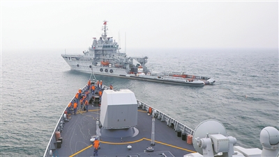 時(shí)值寒冬,海上風(fēng)力強(qiáng)勁。抵達(dá)某海域后,齊齊哈爾艦?zāi)M遭受“敵”襲擊失去動力,編隊(duì)即刻展開拖帶訓(xùn)練。相關(guān)艦船部署人員迅速到達(dá)指定位置,各司其職,備便工具器材,聽令收放拖纜。聞令而動,官兵憑借過硬素質(zhì),通過密切協(xié)同,成功完成拖帶任務(wù)。