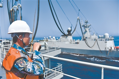 “命令你艦前往某海域,為衡水艦進行油水補給!”處置完浮雷險情,青海湖艦又接到新的命令。官兵立即調(diào)整航向,向目標海域高速機動。抵達后,一系列海上補給作業(yè)緊張有序展開,兩艦之間凌空架起承載索,建立補給連接,順利完成補給任務(wù)。
