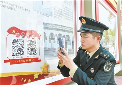 火箭軍某旅通過(guò)多種方式開(kāi)展黨史學(xué)習(xí)教育。圖為3月24日,一名戰(zhàn)士在用手機(jī)掃描文化櫥窗里的黨史知識(shí)鏈接二維碼。范文佳 攝