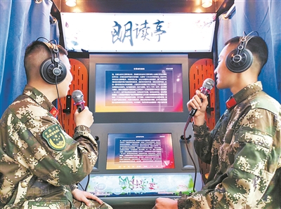 3月16日,武警重慶總隊(duì)執(zhí)勤三支隊(duì)城口中隊(duì)官兵在軍營(yíng)朗讀亭朗讀紅色故事,學(xué)習(xí)黨史知識(shí)。李東 攝