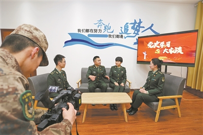 第80集團(tuán)軍某旅在旅電視臺(tái)推出“黨史學(xué)習(xí)大家談”欄目,推動(dòng)黨史學(xué)習(xí)教育走向深入。圖為官兵正在參與節(jié)目錄制。陳健 攝