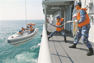 吊放小艇,開展救生演練。