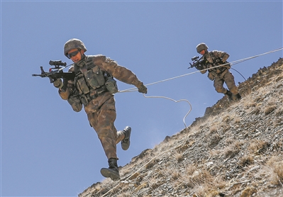 車隊(duì)疾馳30公里后,到達(dá)一片陌生地域。“發(fā)現(xiàn)‘暴恐分子’,實(shí)施抓捕!”連長楊鵬賓一聲令下,各戰(zhàn)斗小組迅速投入戰(zhàn)斗。隊(duì)員們攀登滑降、隱蔽接敵,兵分多路實(shí)施圍剿,成功制服“暴恐分子”。