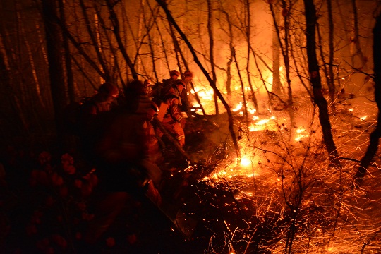 此時,火場上空濃煙遮天蔽日,不時還翻滾出紅色的火舌,地下火、地表火、樹冠火立體燃燒,火勢異常兇猛。“熱浪烤得人都睜不開眼睛。”消防員范曉斌對當(dāng)時情景記憶猶新。根據(jù)上級命令,中隊擔(dān)負(fù)整個火場火勢最激烈、地形最復(fù)雜、條件最艱苦的東南線。攻堅分隊逆火而行,采取“分兵合圍”戰(zhàn)法,運用新裝備展開立體作戰(zhàn),鏖戰(zhàn)兩天兩夜終將大火撲滅,打贏了轉(zhuǎn)制后的第一場硬戰(zhàn)。