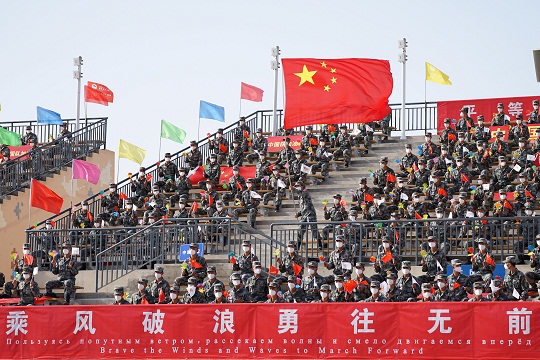 旌旗迎風(fēng)招展,和平友誼同筑。白俄羅斯、埃及、俄羅斯、烏茲別克斯坦、委內(nèi)瑞拉、越南參賽代表隊(duì)依次入場(chǎng)。當(dāng)一面面不同國(guó)家的國(guó)旗通過觀禮臺(tái)時(shí),現(xiàn)場(chǎng)官兵熱烈鼓掌,對(duì)遠(yuǎn)道而來的參賽隊(duì)員表示歡迎。東道主中國(guó)參賽代表隊(duì)最后一個(gè)入場(chǎng),參賽隊(duì)員們軍容嚴(yán)整、精神抖擻,在五星紅旗引領(lǐng)下通過觀禮臺(tái)。
