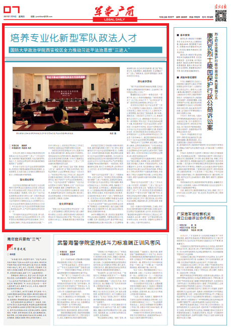 習(xí)近平法治思想蘊(yùn)含著馬克思主義法治原理同中國軍事法治實踐相結(jié)合的重大理論創(chuàng)新。中央全面依法治國工作會議召開后不久,西安校區(qū)就遴選一批教授、專家,成立“習(xí)近平法治思想理論成果學(xué)習(xí)研究小組”,對相關(guān)理論進(jìn)行深度化體系化學(xué)習(xí)研究。今年1月,國防大學(xué)習(xí)近平新時代中國特色社會主義思想研究中心習(xí)近平法治思想研究基地在西安校區(qū)正式成立,率先走出將習(xí)近平法治思想貫徹落實到深入推進(jìn)依法治軍、從嚴(yán)治軍實踐理論研究的堅實一步。