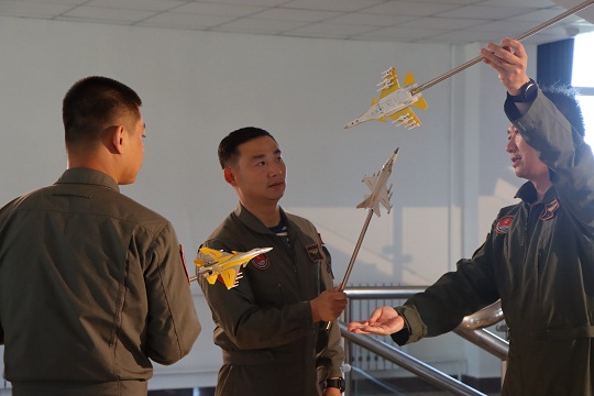 圖為海軍航空大學某基地組織地面演練,這是飛行教官丁陽(右一)正用飛機模型教授學員戰(zhàn)術動作。趙天淏 攝