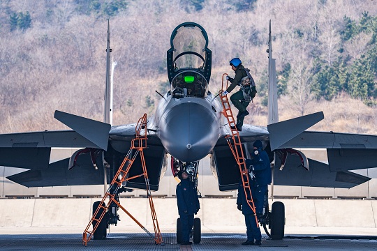 海軍航空大學某基地組織飛行訓練,圖為飛行教官在機務人員的幫助下登上殲-15戰(zhàn)機。萬全 攝