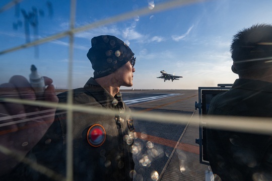 圖為海軍航空大學某基地艦載機飛行教官們在引導學員進行陸基模擬著艦訓練。萬全 攝