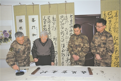 活動現場,女生獨唱《莫斯科郊外的晚上》、詩朗誦《奮進一流譜新篇》……一個個軍地聯合自編自演的節(jié)目受到歡迎。洛陽市書畫院的書法愛好者現場揮毫潑墨,多種書體各顯神韻。老干部、老阿姨拿著一副副寓意深刻、飽含祝福的春聯、“?!弊?,喜笑顏開。