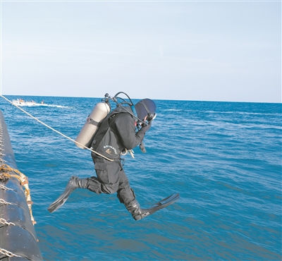 圖②:潛水員躍入水中,營(yíng)救“落水人員”。