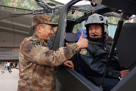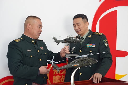 圖為汪曉紅(右)向一級(jí)軍士長(zhǎng)喬壽和了解不同型號(hào)直升機(jī)性能差異。張永進(jìn) 攝