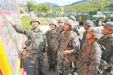 炎炎夏日,練兵正酣。第82集團軍某旅注重發(fā)揮榮譽激勵作用,在訓練場立起榮譽墻,把官兵的先進事跡及時“曬”出來,以此激勵大家學習先進、爭當標兵。圖為訓練間隙,五連戰(zhàn)士代鵬(左一)向戰(zhàn)友介紹自己的比武奪冠經(jīng)歷。陶磊 攝