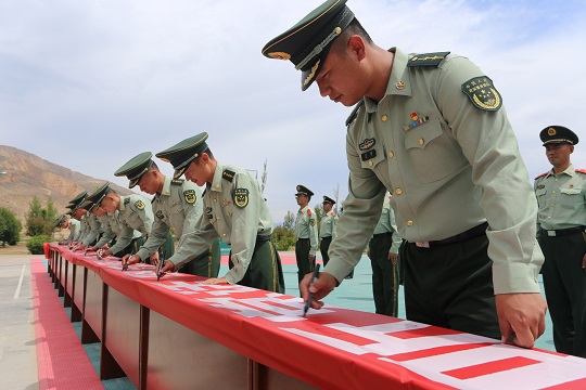 武警青海總隊(duì)機(jī)動(dòng)二支隊(duì)演訓(xùn)場(chǎng)上,官兵們跨彈坑、攀云梯、翻高墻……突然一聲哨響:全體集合!大家集體重溫入黨誓詞。之后,官兵在寫有“永遠(yuǎn)聽黨話,堅(jiān)定跟黨走,喜迎二十大,奮進(jìn)新征程”的橫幅上寫下自己的名字。