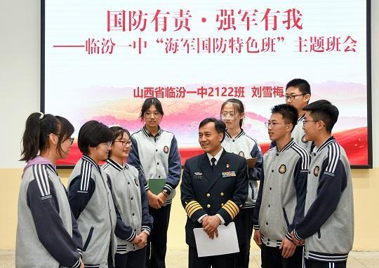 圖為臨汾軍分區(qū)大校政治委員劉海洋(右三)為臨汾第一中學“海軍國防特色班”學生講述經典戰(zhàn)例。李旭峰 攝