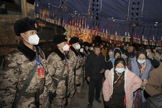 在西寧市湟中區(qū)塔爾寺,酥油花展再現(xiàn)“佛前花開”,游客絡繹不絕,執(zhí)勤官兵嚴密注視著人群及周邊情況。在現(xiàn)場指揮的武警青??傟牂C動一支隊支隊長趙華表示:“任務期間,我們的官兵絕不會有絲毫放松。”