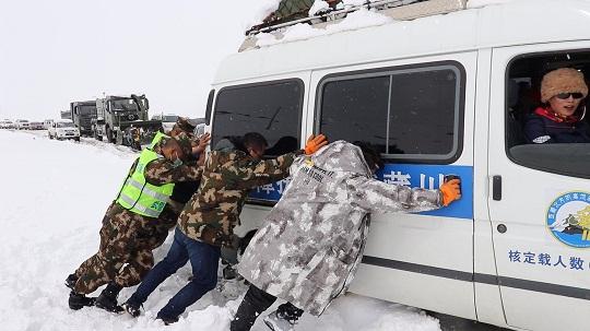 每年11月至次年4月,養(yǎng)護(hù)路段平均積雪深20厘米,暗冰也有10厘米厚。2021年4月,連夜降雪導(dǎo)致一臺(tái)電建部門的車輛陷入邊溝,亟待救援。