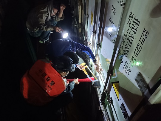 圖為執(zhí)法人員開(kāi)啟裝載凍品集裝箱。