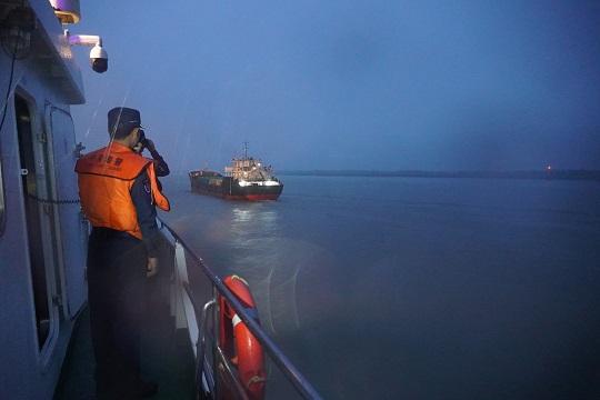 6月18日8時(shí),上海海警局執(zhí)法艇在長(zhǎng)江口南槽航道附近海域巡邏時(shí),發(fā)現(xiàn)一艘貨船使用的是篡改后的AIS,屬于“套牌船”。執(zhí)法艇靠前對(duì)其進(jìn)行喊話示警,并登臨檢查該船。經(jīng)查,該船共有6名船員,裝載牛肚等凍品約200噸,案值約2000萬(wàn)元。