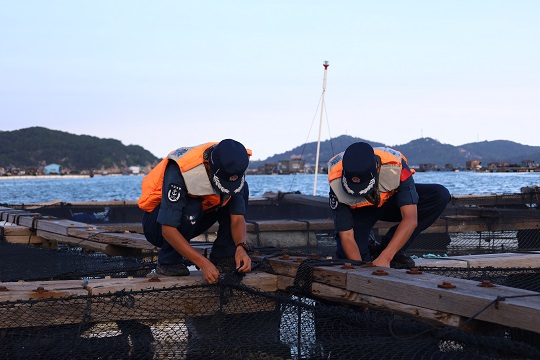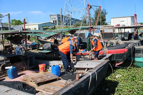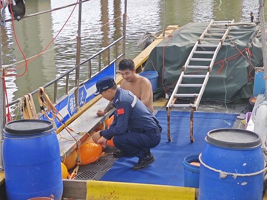 圖為幫助漁民做好加固纜繩,檢查船體設(shè)備。