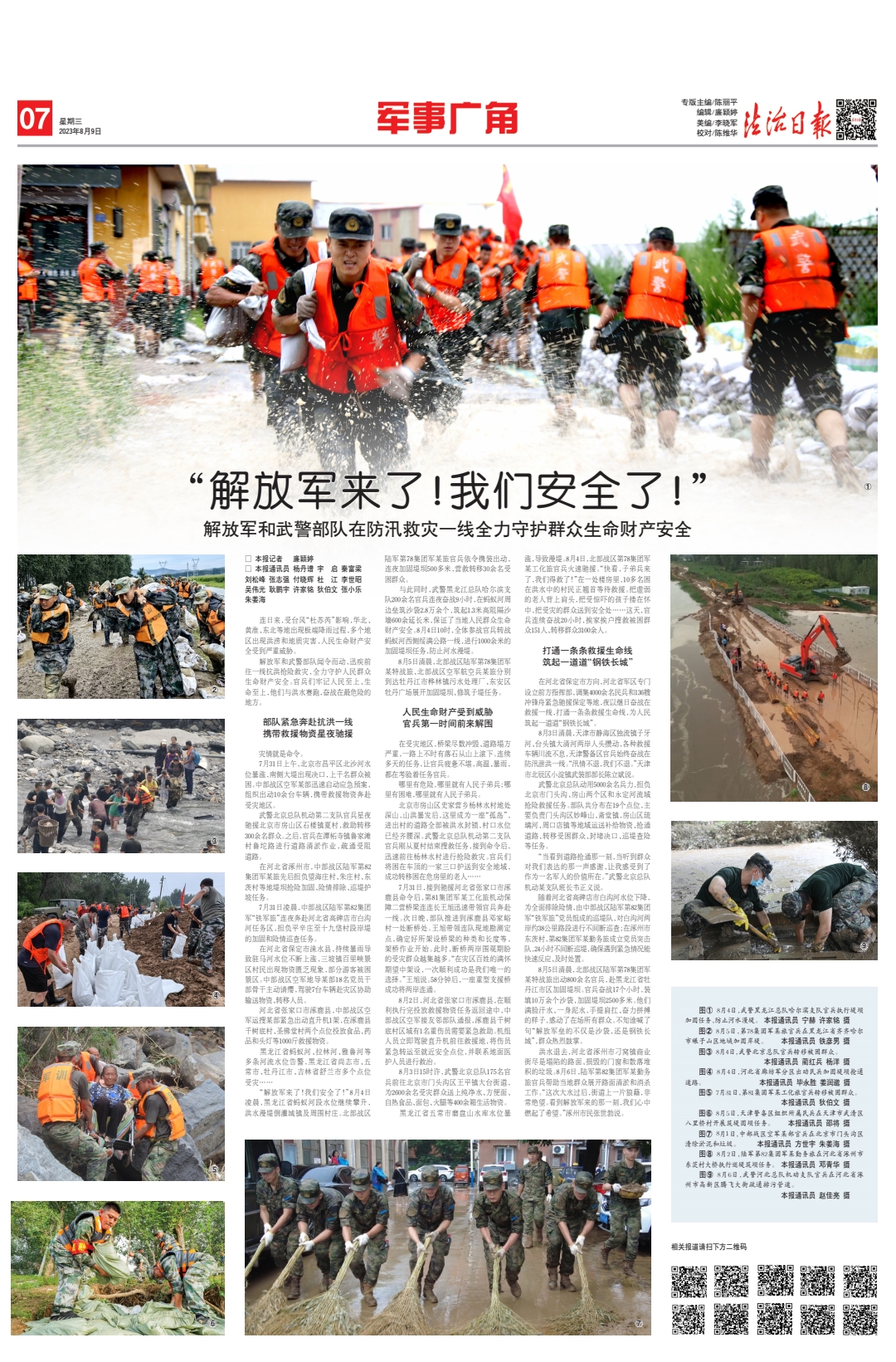 解放軍和武警部隊聞令而動,迅疾前往一線抗洪搶險救災,全力守護人民群眾生命財產安全。官兵們牢記人民至上、生命至上,他們與洪水賽跑,奮戰(zhàn)在最危險的地方。