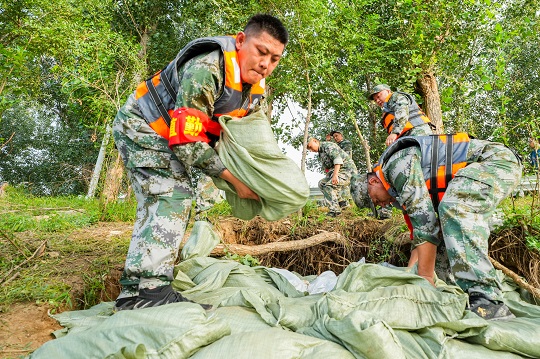 圖為8月4日,武警黑龍江總隊哈爾濱支隊官兵執(zhí)行堤壩加固任務,防止河水漫堤。本報通訊員 寧赫 許家銘 攝