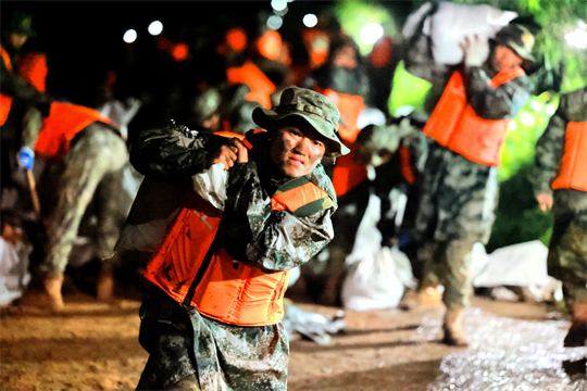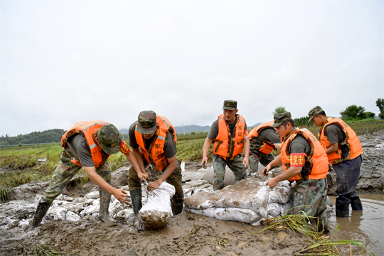在某合成旅,眼看著水位越漲越高、水流越來越急、塌方越來越大,從旅長到列兵,大家冒雨喊著“人在堤在”口號,一刻不停地鏟沙土、裝沙袋、堆沙墻。列兵鐘習(xí)文患有精索靜脈曲張,因長時間泡在水里導(dǎo)致墜脹和疼痛讓他直冒冷汗。身上痛手上活卻沒停,他一次又一次背著沙袋,一路小跑沖向河堤。