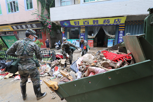 圖為武警第二機(jī)動(dòng)總隊(duì)某支隊(duì)救援官兵在一線清運(yùn)垃圾。薛東東 攝