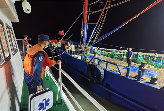 接警后,上海海警局立即調(diào)派距離最近的奉賢海警局執(zhí)法艇前往事發(fā)海域救援。23時(shí)30分,海警執(zhí)法艇克服能見度不良、海面漁船漁網(wǎng)多等不利因素,在佘山島以東海域發(fā)現(xiàn)漁船并轉(zhuǎn)移傷員,隨船衛(wèi)生員根據(jù)其受傷情況采取傷口消毒、包扎固定等先期救助措施。同時(shí),崇明海警局協(xié)調(diào)120急救部門,派出專業(yè)力量到橫沙漁港碼頭待命。