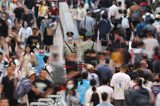 圖為執(zhí)勤哨兵佇立在流動的旅客人群中。陳春越 攝