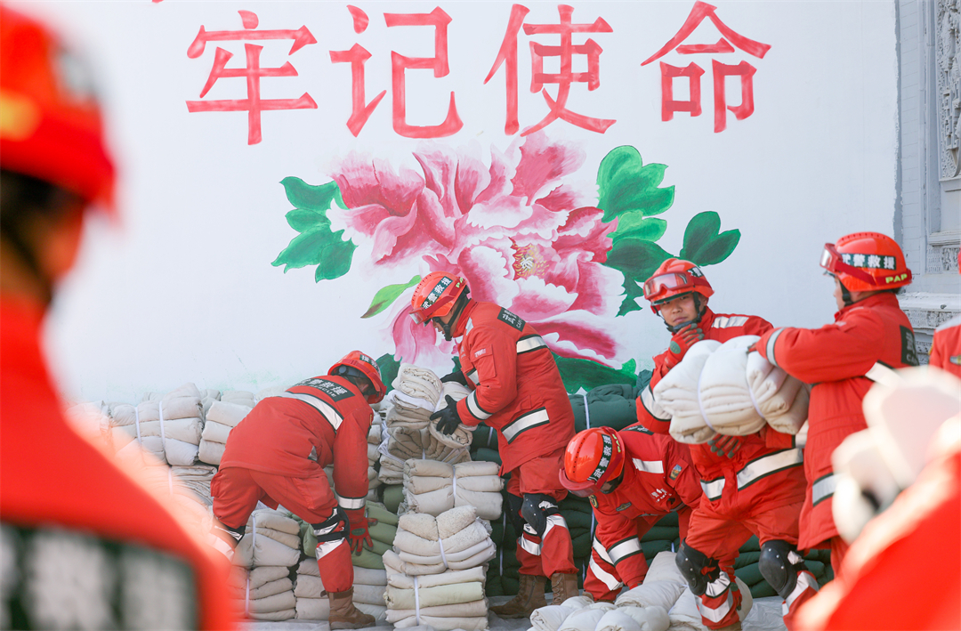圖為12月20日,武警甘肅總隊官兵在甘肅省臨夏回族自治州積石山縣劉集鄉(xiāng)肖家村為災民提供御寒物資。