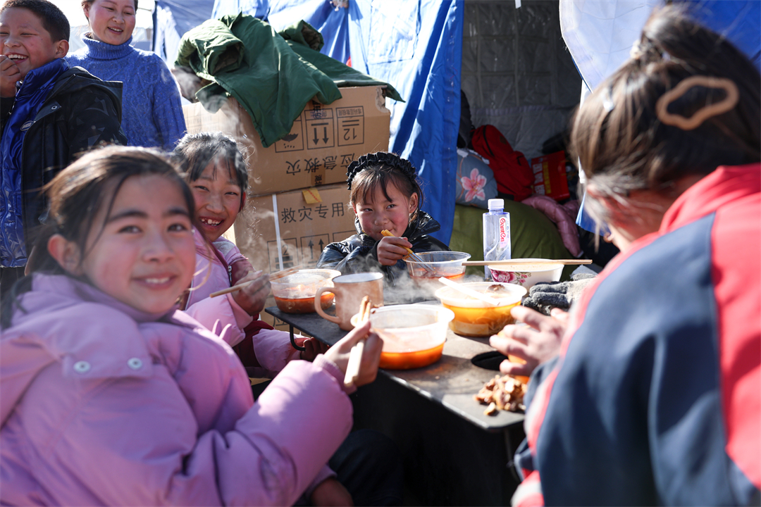 圖為12月21日,在甘肅省臨夏州積石山縣劉集鄉(xiāng)陽屲村安置點(diǎn),小朋友們吃著武警甘肅總隊臨夏支隊官兵制作的熱食,臉上露出了幸福的笑容。