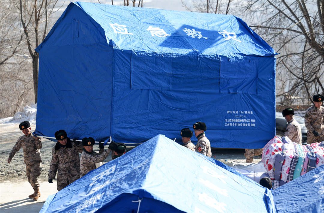 圖為12月21日,武警甘肅總隊臨夏支隊官兵在積石山縣劉集鄉(xiāng)陽屲村搭建的帳篷。