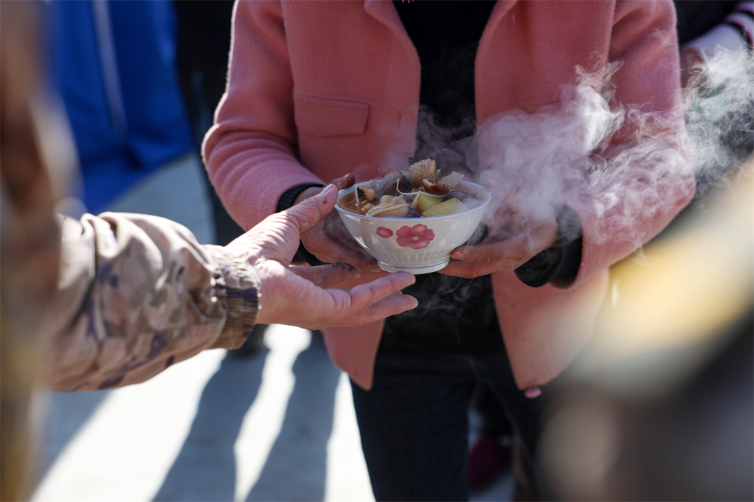 圖為12月21日,武警甘肅總隊臨夏支隊官兵在積石山縣劉集鄉(xiāng)陽屲村為受災(zāi)群眾供應(yīng)熱食。