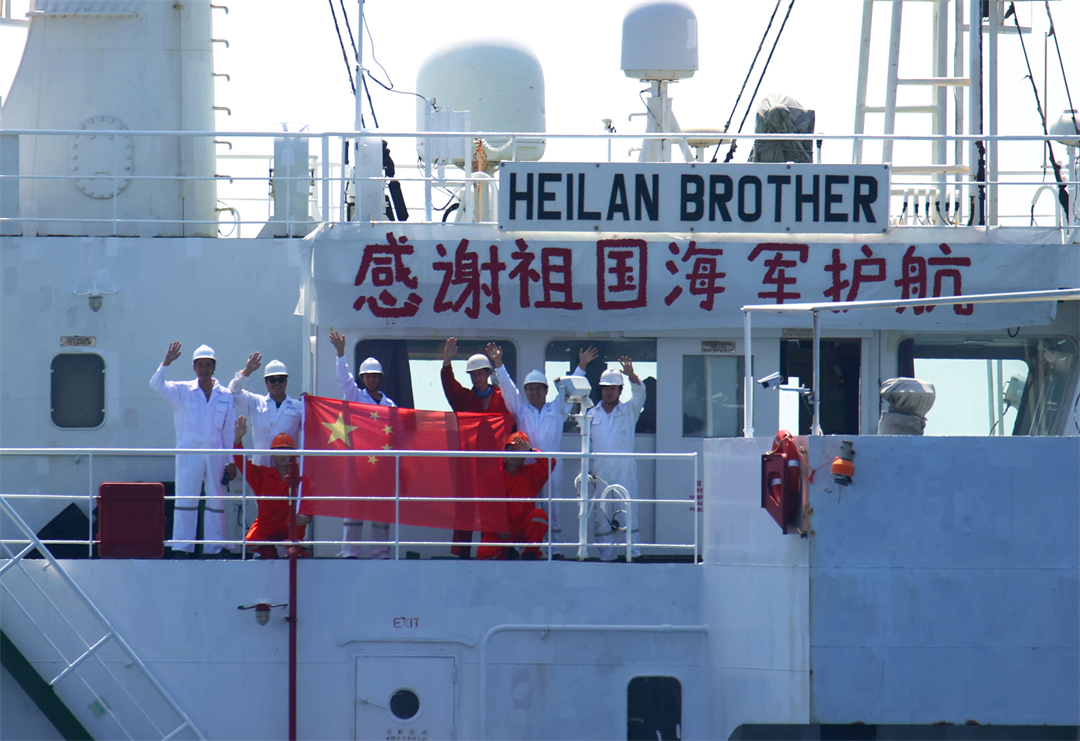 圖為2022年11月5日,在亞丁灣上“海瀾之友”散貨船船員安全感“爆棚”,自發(fā)地懸掛起“感謝祖國(guó)海軍護(hù)航”的橫幅,并跑上甲板,興奮地展開五星紅旗,向淮南艦揮手致謝。馬玉彬 攝
