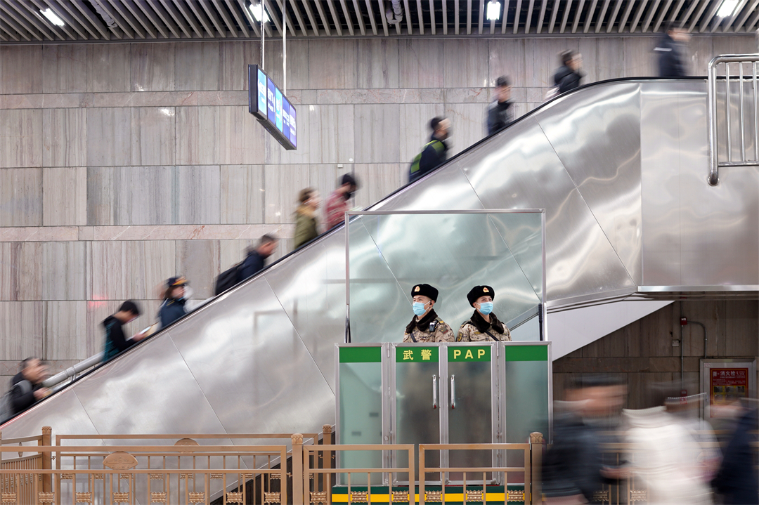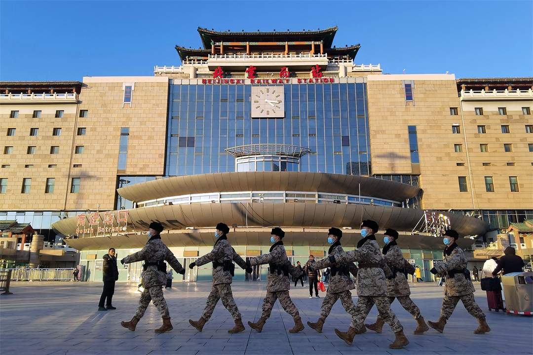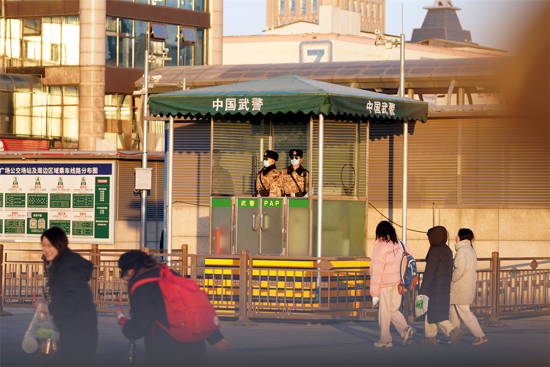 圖為北京西站南廣場武警正在認(rèn)真履職。