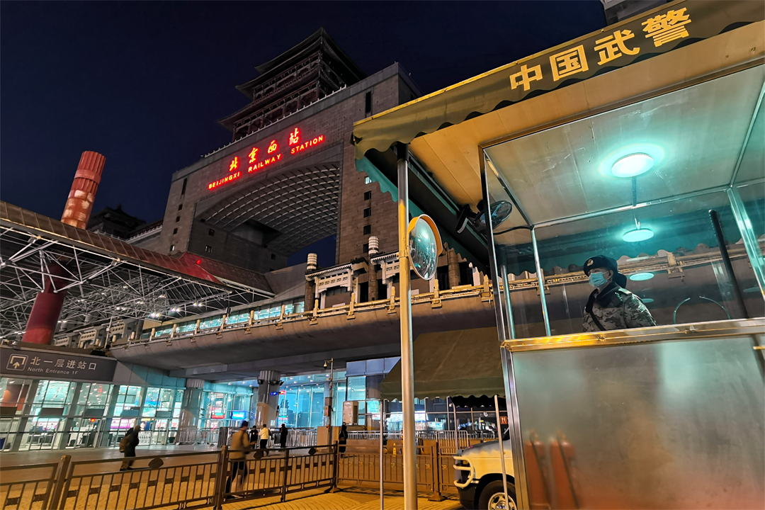 圖為北京西站北廣場哨兵正在夜間執(zhí)勤。