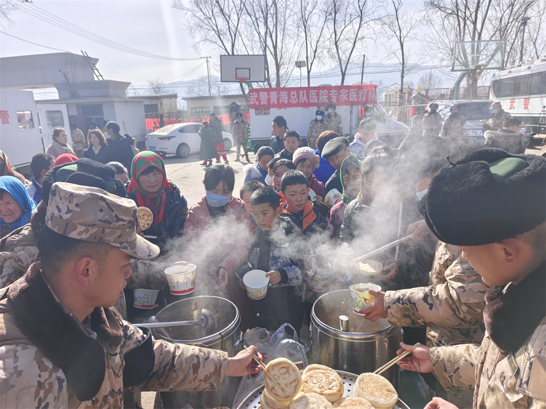 為了讓群眾吃飽吃好,武警青海總隊20余名炊事員制作熱食。熱氣騰騰的羊肉粉湯做熟了,配上熱乎乎的餅子,約200名群眾吃上了災(zāi)后第一頓熱乎飯。炊事員們一日三餐為群眾提供充足的熱食,一名老大爺感動得老淚縱橫:“身子暖和了,心里更暖……”