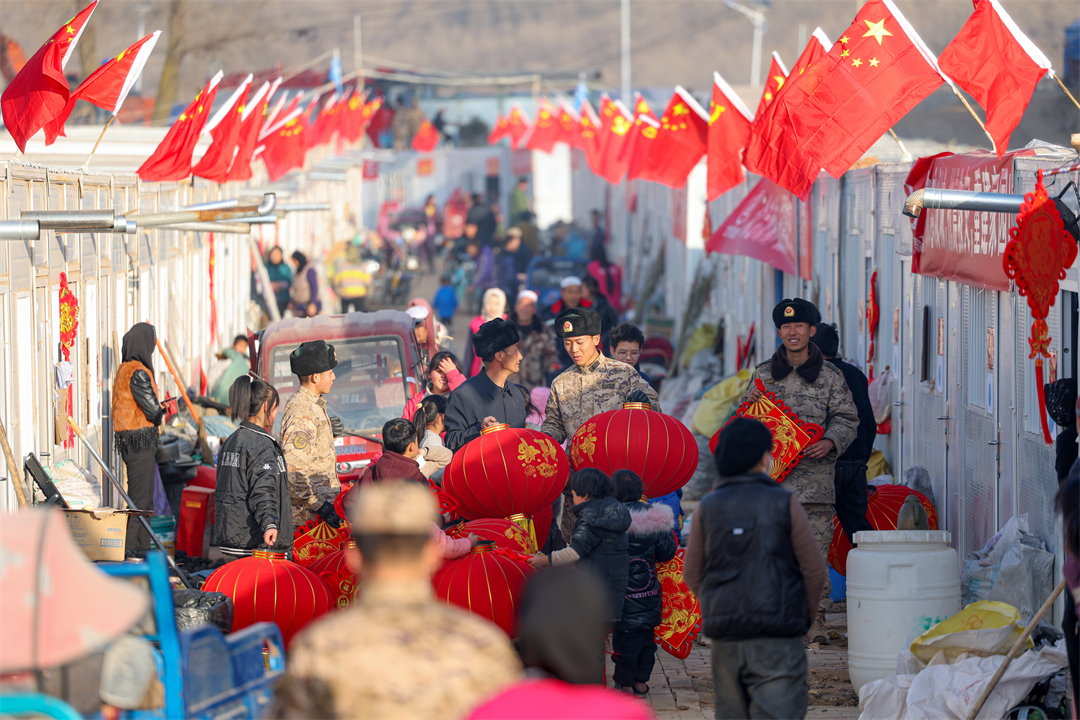 圖為元旦期間,武警甘肅總隊臨夏支隊官兵在積石山縣劉集鄉(xiāng)陽屲村,為臨時安置點村民送去燈籠和中國結(jié)。侯崇慧 攝