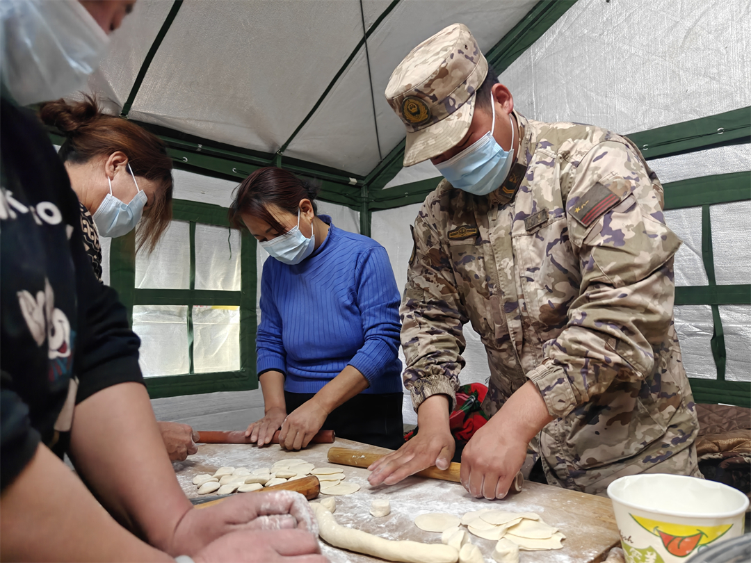 “小伙子有對象了沒?”在青海省海東市民和縣中川鄉(xiāng)安置點帳篷里,武警青??傟牬妒聠T和群眾一邊包餃子,一邊聊天,有阿姨給單身戰(zhàn)士介紹對象,大家有說有笑,現(xiàn)場充滿溫情。
