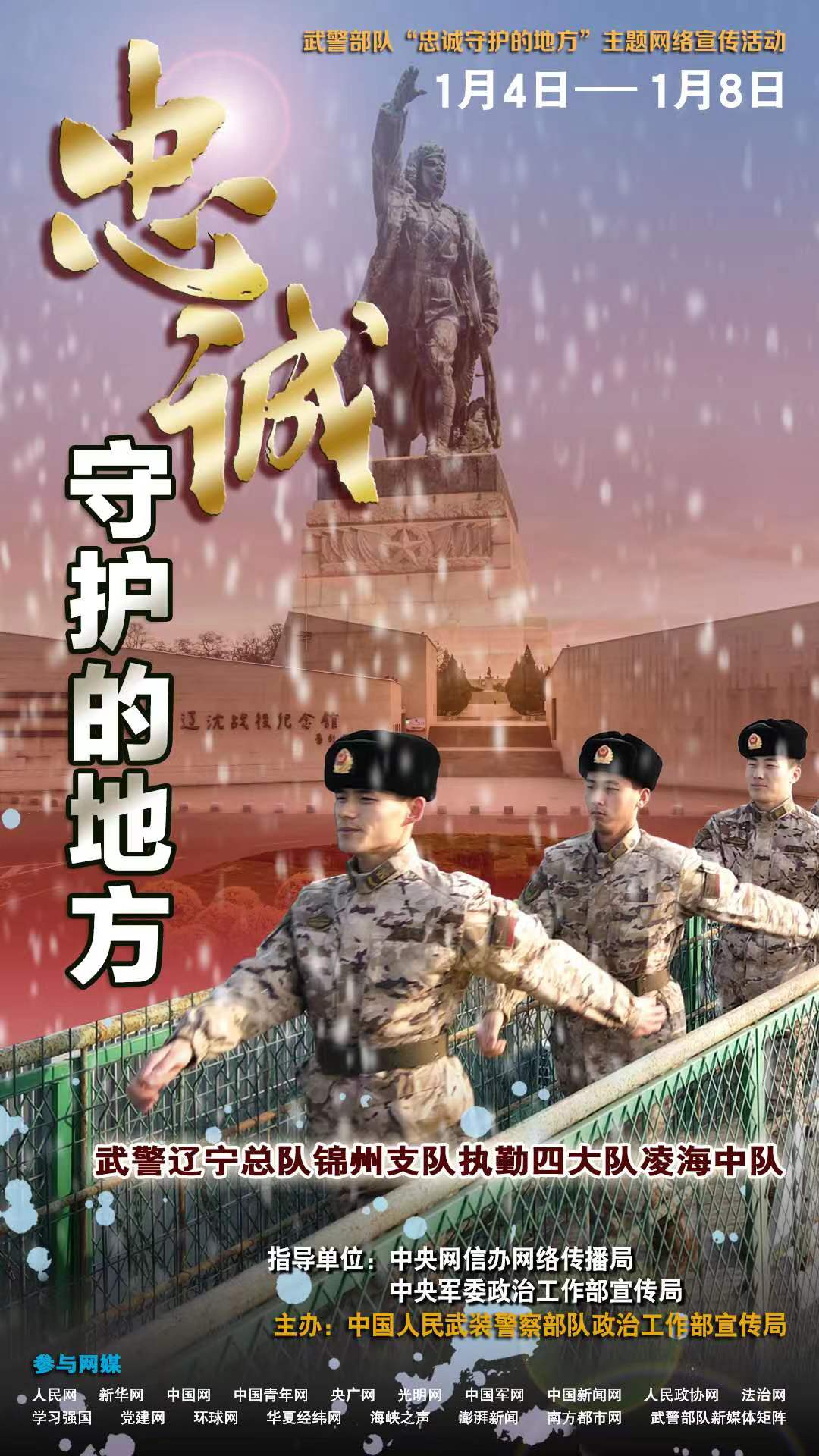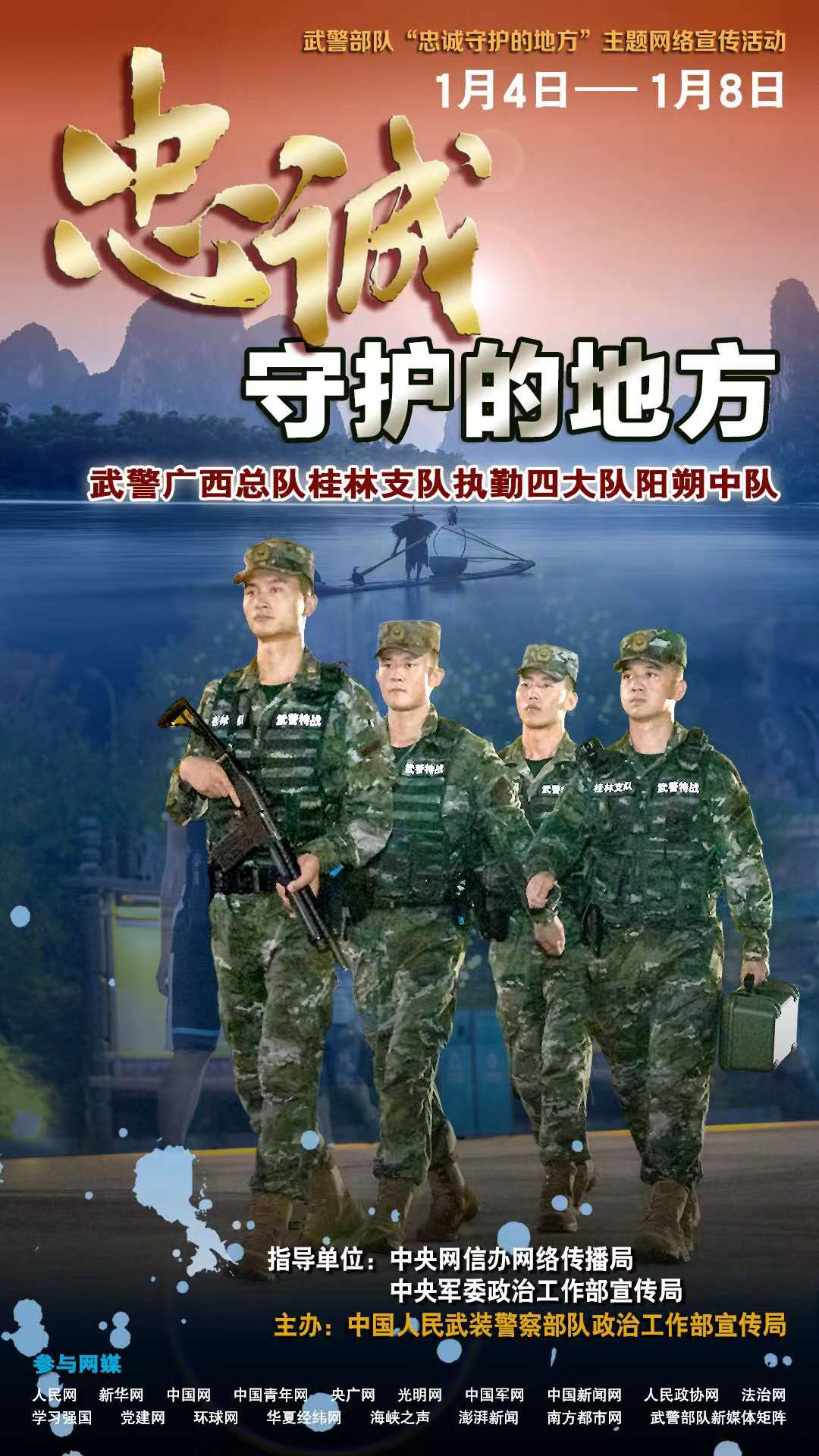 據(jù)悉,此次活動(dòng)已完成前期采訪,網(wǎng)上宣傳于1月4日啟動(dòng),將持續(xù)至1月8日,屆時(shí)人民網(wǎng)、新華網(wǎng)、中國(guó)軍網(wǎng)等多家主流網(wǎng)媒,每日以圖文、視頻等形式依次對(duì)受訪單位展開(kāi)報(bào)道,武警部隊(duì)新媒體矩陣同步跟進(jìn)推送。